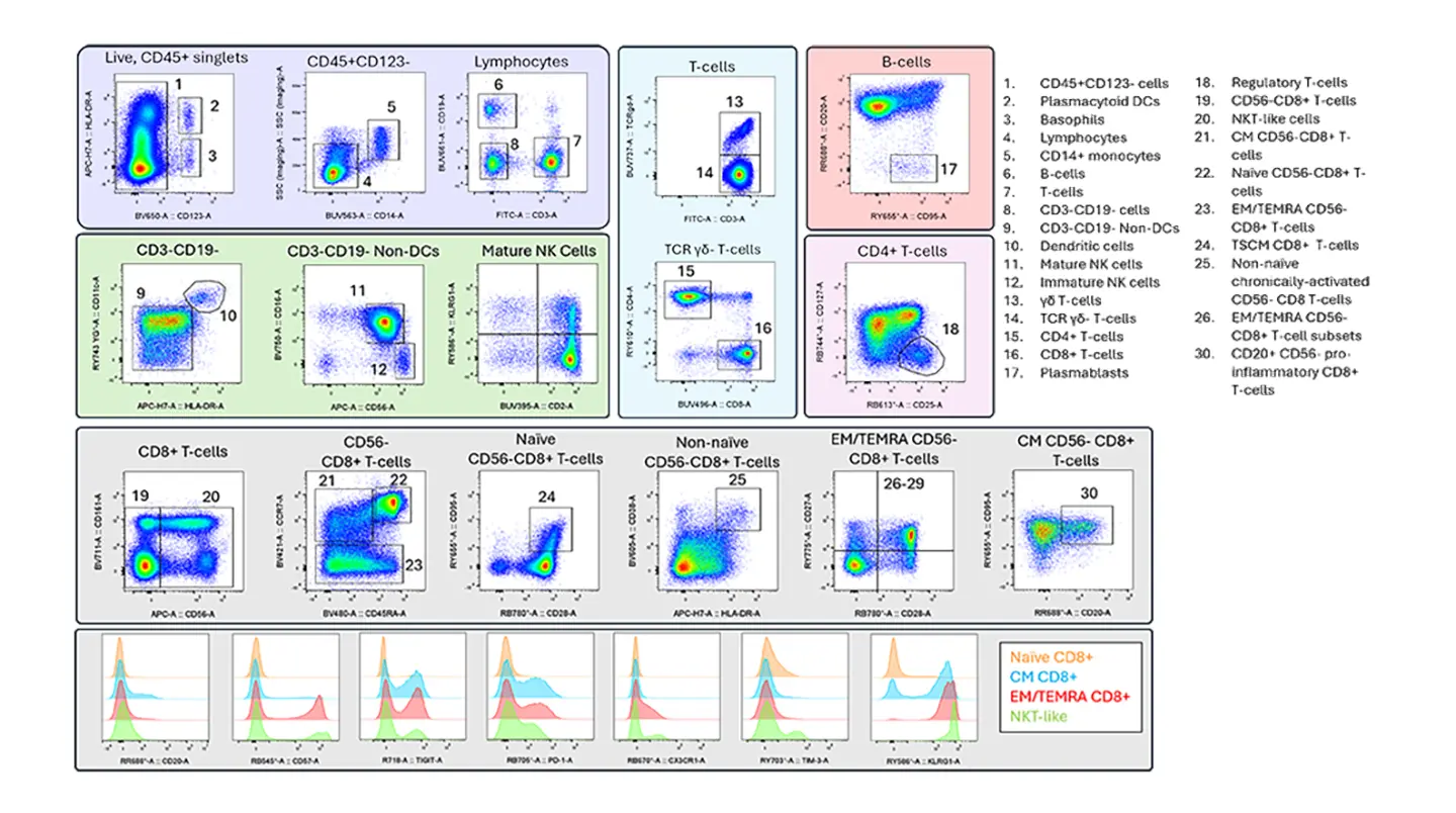 Fluorochrome marker assignment for a 30-color spectral flow cytometry panel