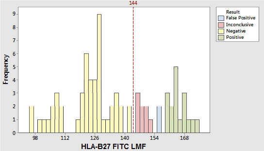 A study was performed to characterize this cross-reactivity by comparing results obtained using the HLA-B27 reagent with results obtained using either cytotoxicity or molecular testing methods. Seventy-seven specimens were stained in triplicate and acquired by each of multiple operators on two BD FACSCanto instruments. Results are shown in the figure above. All seventeen HLA-B27–positive specimens were above the decision marker plus 10 channels (LMF channel 154). Fifty HLA-B27–negative specimens were below the decision marker (LMF channel 144). Eight HLA-B27–negative specimens were within 144 and 154 LMF. Two HLA-B27–negative specimens were above 154 LMF. Based on our study and literature data8 a majority of the crossreactive specimens that fell on the positive side of the decision marker (LMF channel 144) were within 144 and 154 LMF.