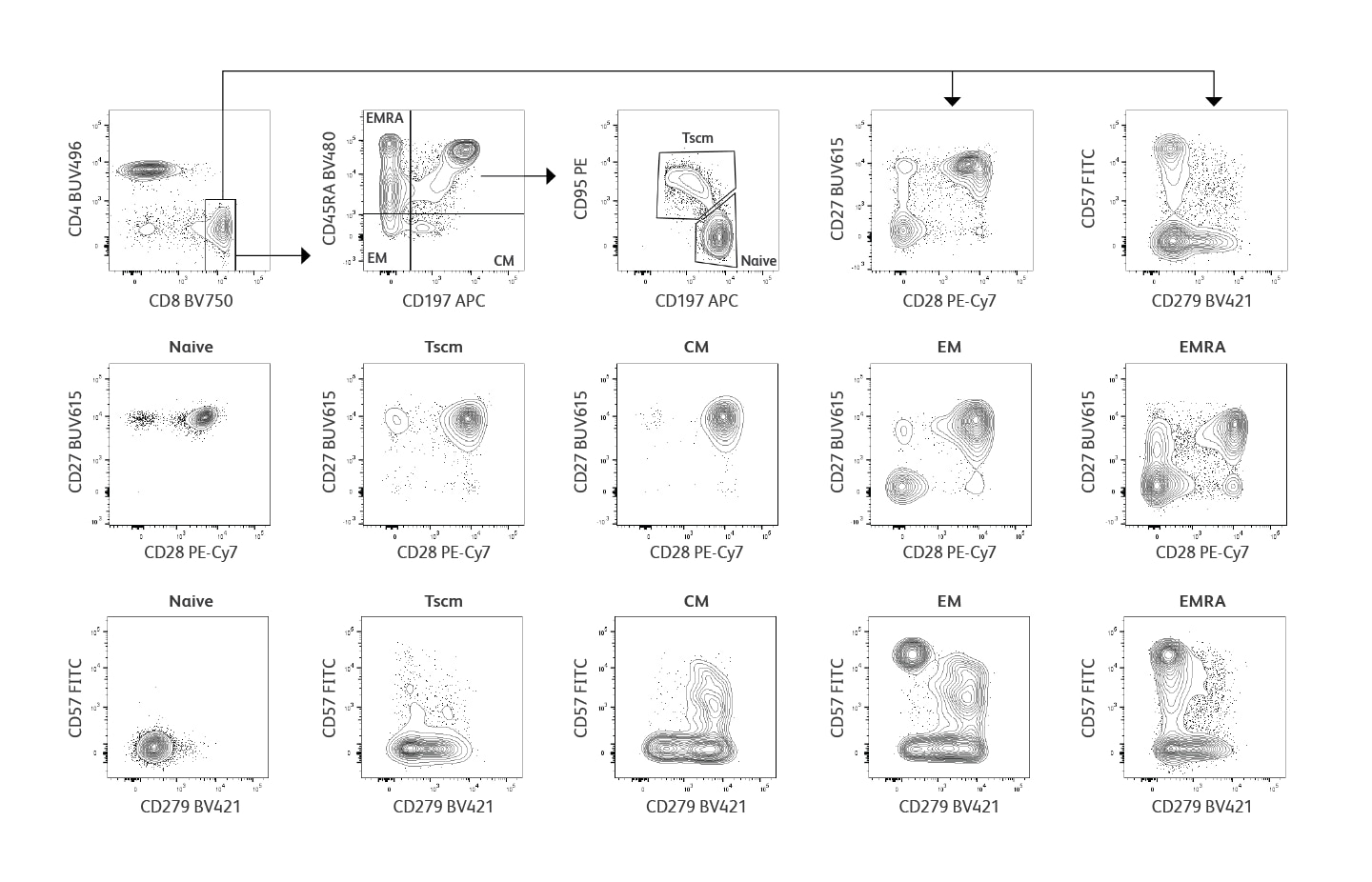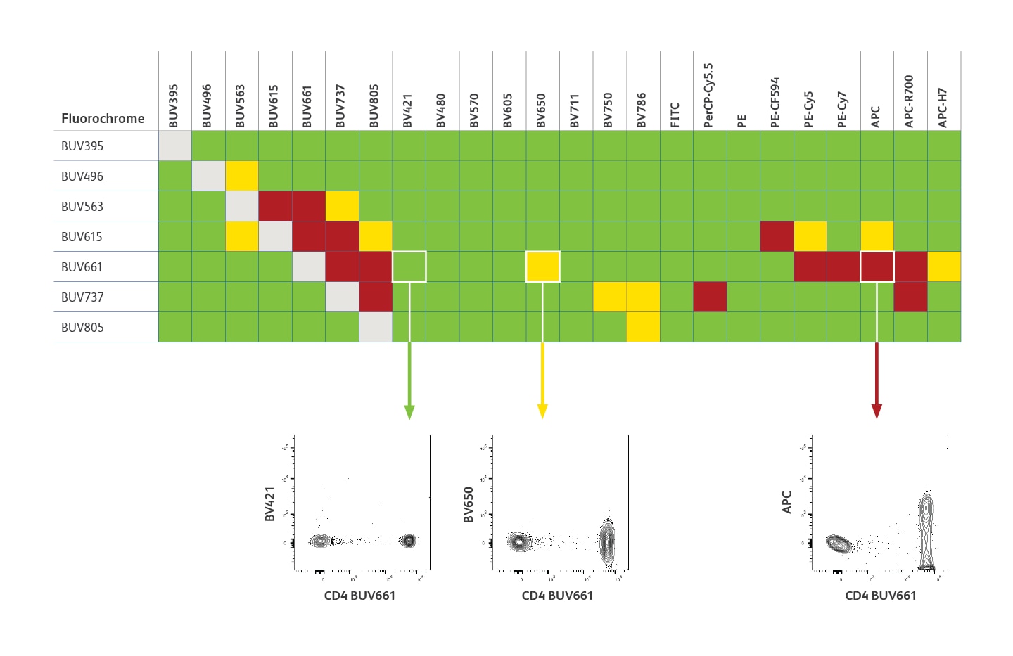 A strategic set of fluorochromes with minimal spillover, including three BUV dyes were used. This combination of fluorochromes enables simplified panel design by reducing challenging fluorochrome combinations and allows for generation of high-quality data through minimal introduction of spread.