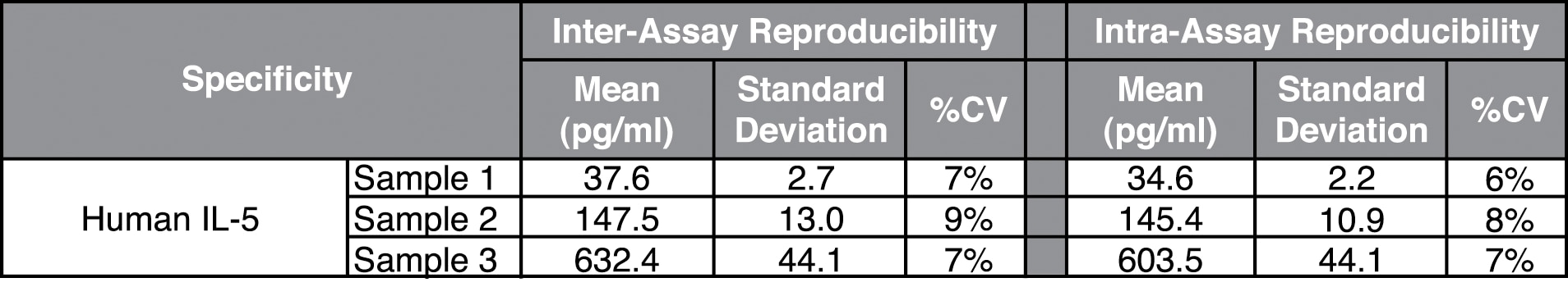 Reproducibility: The inter-assay and intra-assay reproducibility were determined for the BD CBA Human IL-5 Flex Set by evaluating ten