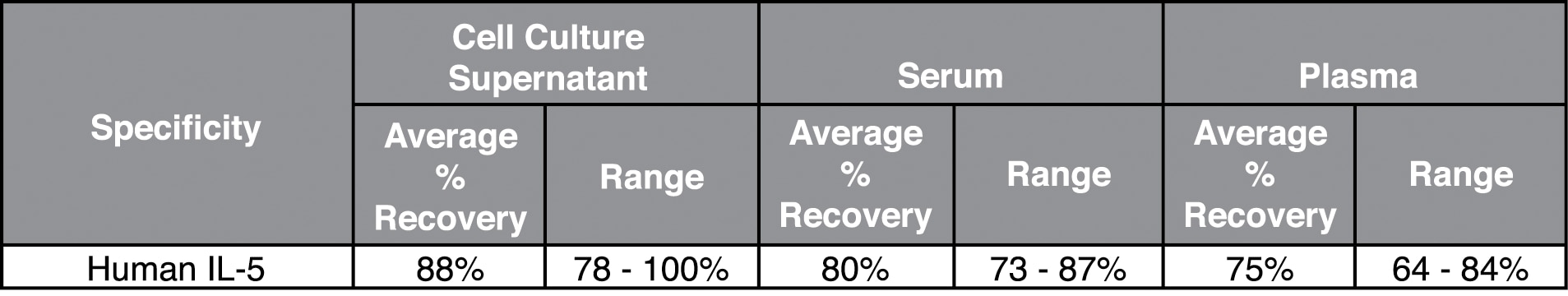 Recovery: Cell culture supernatant, serum, or EDTA-treated plasma were spiked with three different levels of protein. The spiked samples were assayed and the results were compared with expected values. Serum and plasma samples were diluted 1:4 before the protein was spiked into each. Serum is a pool of 800 - 1000 donors and the plasma was pooled from at least 20 donors.
