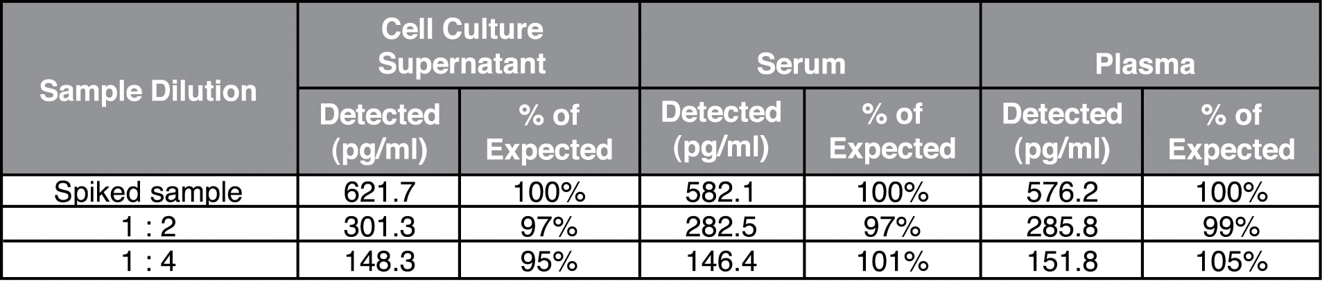 Linearity: Cell culture supernatant, 1:4 diluted serum, or 1:4 diluted EDTA-treated plasma were spiked with protein and serially diluted. The diluted samples were assayed and the results were compared with the original spiked sample.