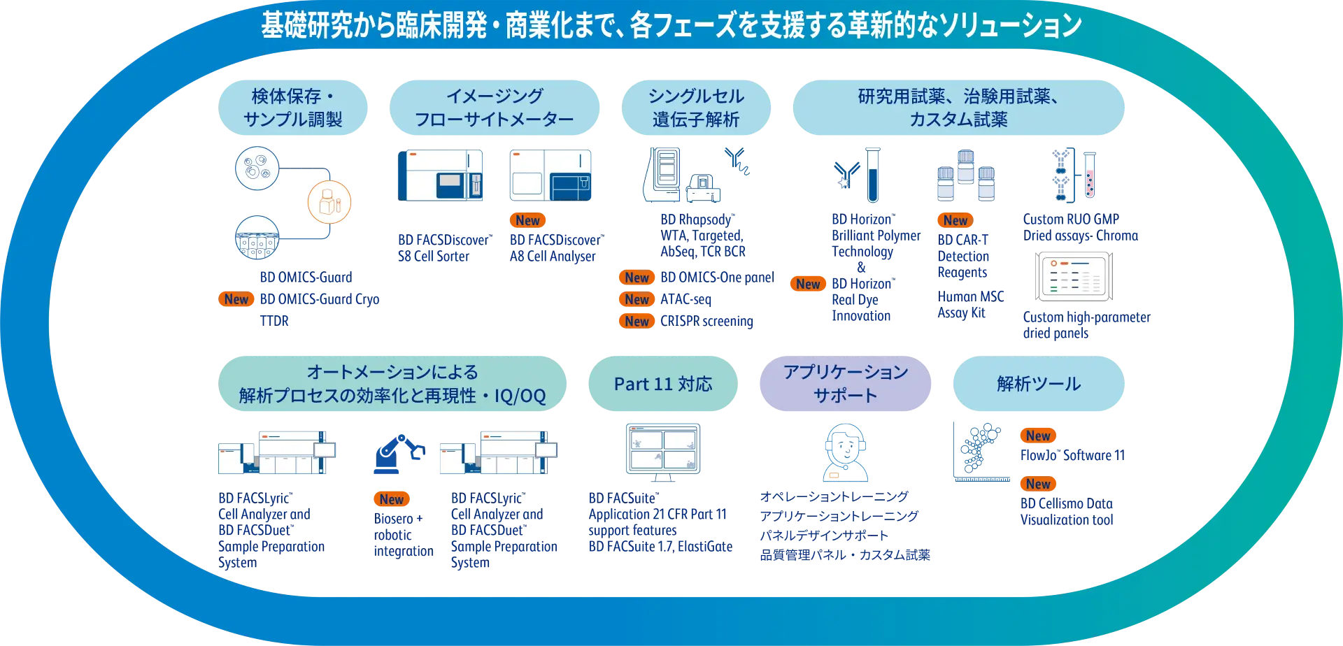 再生医療には、細胞の確かな品質と再現性の高いプロセスが不可欠です。BD は、サンプル保存から解析、QC、製造に至るまで、ワークフロー全体を支えるソリューションを提供します。最新イメージングフローサイトメーターによる高精度の細胞解析、ロボットアームと連携した自動化フローサイトメトリー、次世代の蛍光色素やCAR 検出試薬、高生存率を維持するサンプル保存技術など、研究から製造・臨床応用を見据えたテクノロジーを展示します。