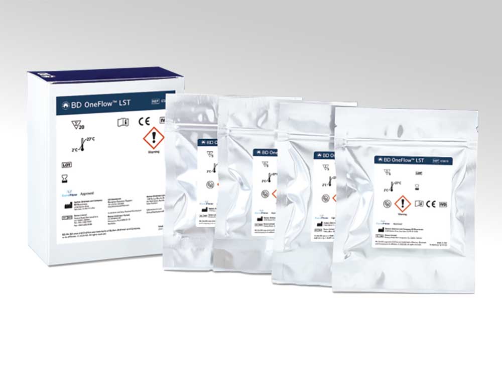 BD OneFlow™ LSTは革新的なBD OneFlow™ ソリューションの一つであり、フローサイトメーターを再現性よくセットアップし、正常細胞集団と異常細胞集団の免疫表現型解析のために検体を染色、測定、解析するための試薬、セットアップビーズ、プロトコール、アッセイテンプレートが一式セットになっています。造血器腫瘍の特性評価に関するEuroFlow™ コンソーシアムの研究と検証作業に基づいて構築されています。1*
