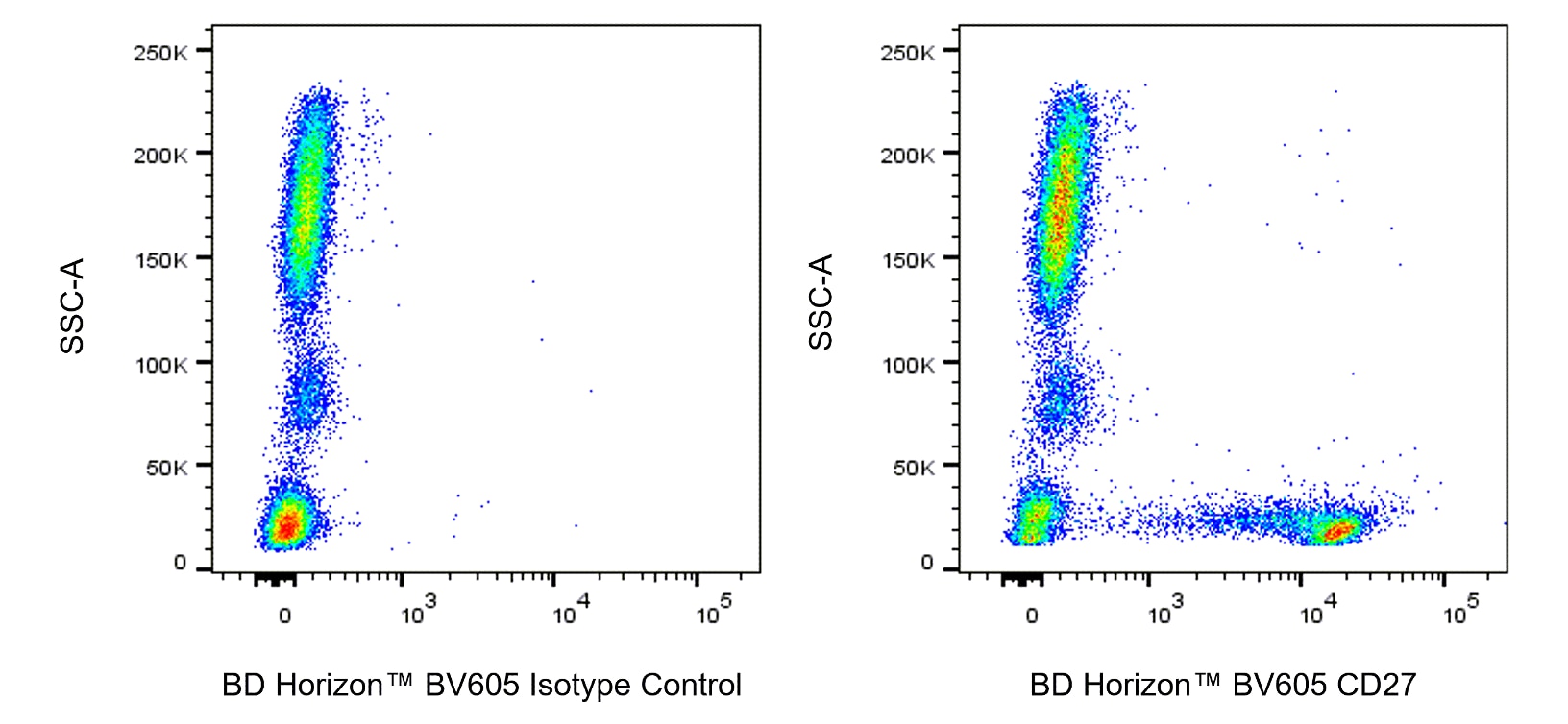 Multiparameter flow cytometric analysis of CD27 expression on Human peripheral blood leucocyte populations. Human whole blood was stained with either BD Horizon™ BV605 Mouse IgG1, κ Isotype Control (Cat. No. 562652; Left Plot) or BD Horizon™ BV605 Mouse Anti-Human CD27 antibody (Cat. No. 569170; Right Plot) at 0.25 µg/test. The erythrocytes were lysed with BD FACS™ Lysing Solution (Cat. No. 349202). The bivariate pseudocolor density plot showing the correlated expression of CD27 (or Ig Isotype control staining) versus side-light scatter (SSC-A) signals was derived from gated events with the forward and side light-scatter characteristics of intact leucocytes. Flow cytometry and data analysis were performed using a BD LSRFortessa™ X-20 Cell Analyzer System and FlowJo™ software. Data shown on this Technical Data Sheet are not lot specific.