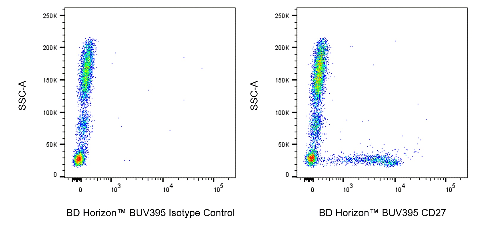 Multiparameter flow cytometric analysis of CD27 expression on Human peripheral blood leukocyte populations. Human whole blood was stained with either BD Horizon™ BUV395 Mouse IgG1, κ Isotype Control (Cat. No. 563547; Left Plot) or BD Horizon™ BUV395 Mouse Anti-Human CD27 antibody (Cat. No. 569712; Right Plot) at 0.5 µg/test. Erythrocytes were lysed with BD FACS™ Lysing Solution (Cat. No. 349202). The bivariate pseudocolor density plot showing the correlated expression of CD27 (or Ig Isotype control staining) versus side-light scatter (SSC-A) signals was derived from gated events with the forward and side-light scatter characteristics of intact leukocytes. Flow cytometry and data analysis were performed using a BD LSRFortessa™ X-20 Cell Analyzer System and FlowJo™ software. Data shown on this Technical Data Sheet are not lot specific.